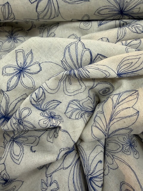 Linnen-Viscose, blauw geborduurd op beige ondergrond